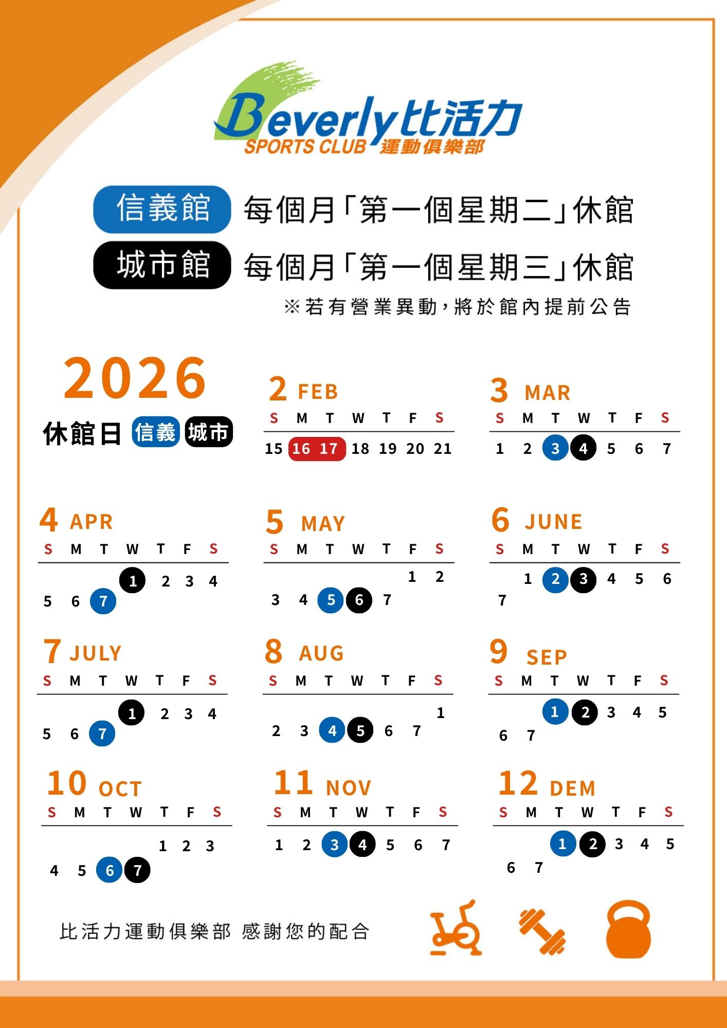 2025年2月開始,比活力休館日公告如下:
